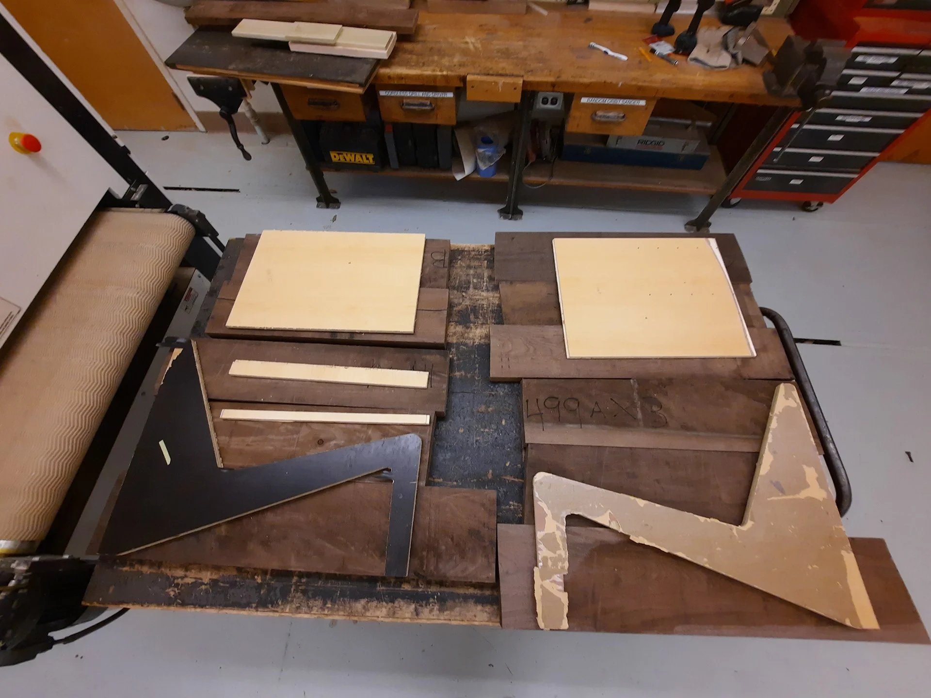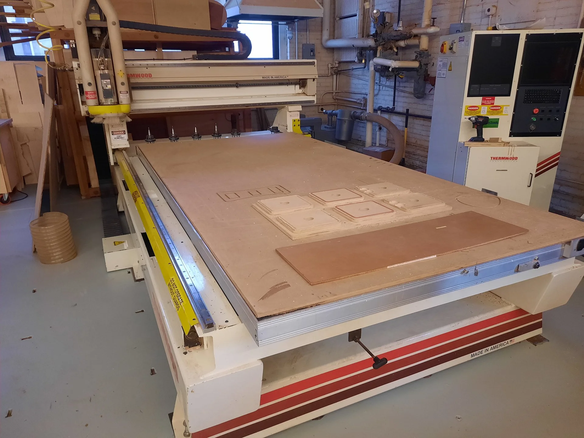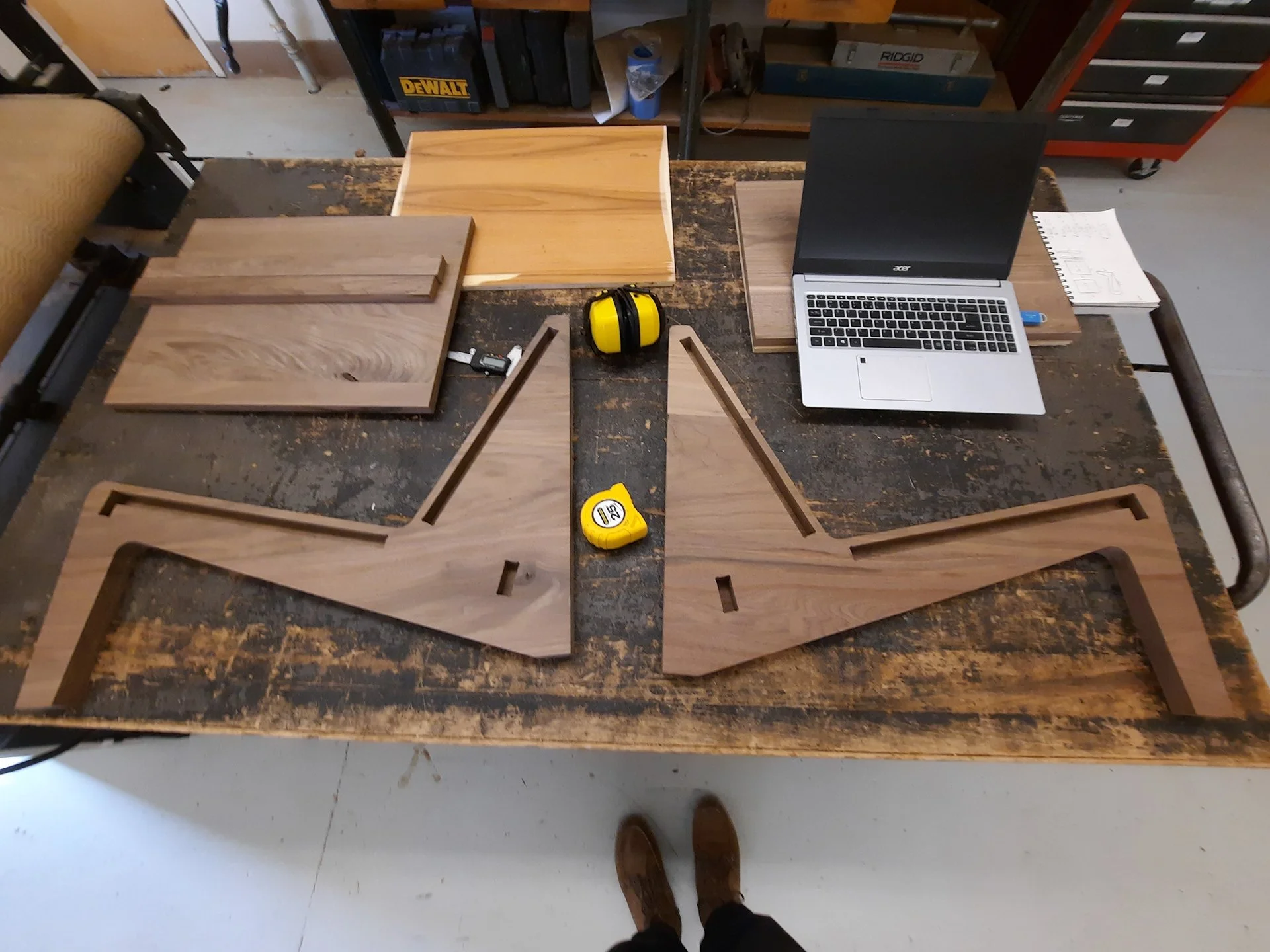 From prototyping you go into processing the wood, which in case was walnut roughly 3 inches thick. From there I processed(various tools and machinery to prepare the wood for CNC cutting) the wood.