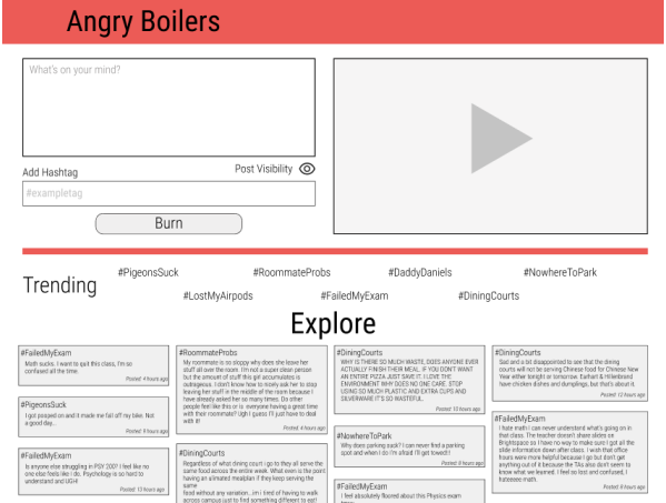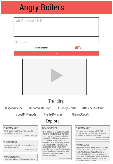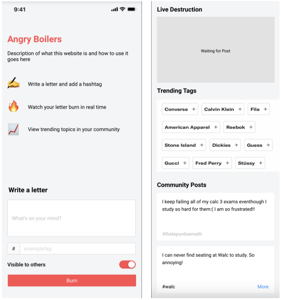 Our final design is a website that allows Purdue students to: write about their issues and annoyances, choose whether they want their post visible to others or not, read what other students are posting about, and watch their letter go up in flames. We found that students need a place to air their grievances without anonymity worries, so our website utilizes a grassroots approach to provide students an immediate response to their frustrations and relief of stress and negativity.